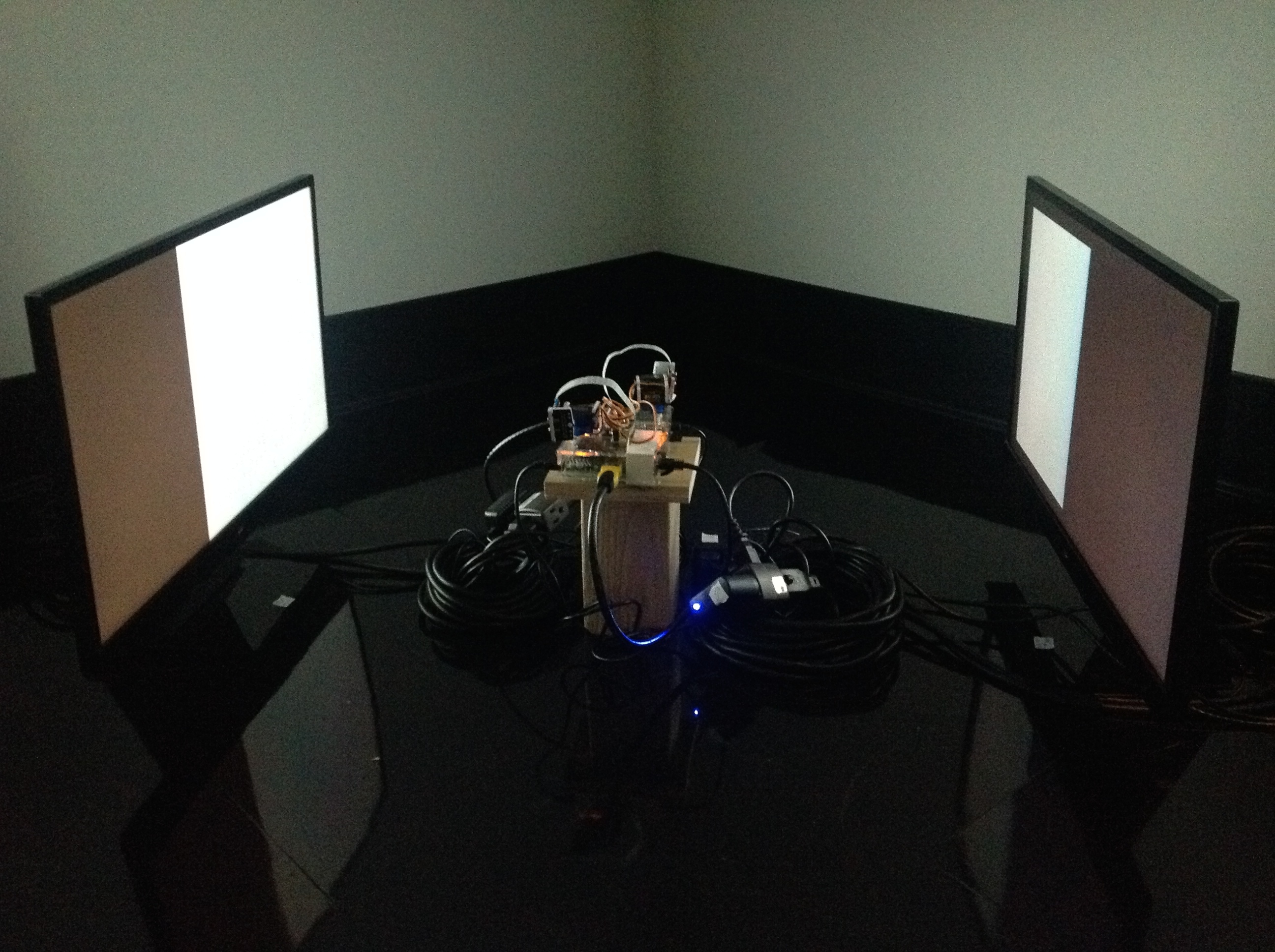 PiAV uses ten networked Raspberry Pi computers. Eight custom-made speakers with embedded Raspberry Pi computers run networked Pure Data patches to provide a continually evolving soundscape. The visual images are created using two Raspberry Pi camera modules, video feedback and custom Python scripts for video processing. A laptop running Max/MSP serves as a central messaging hub.