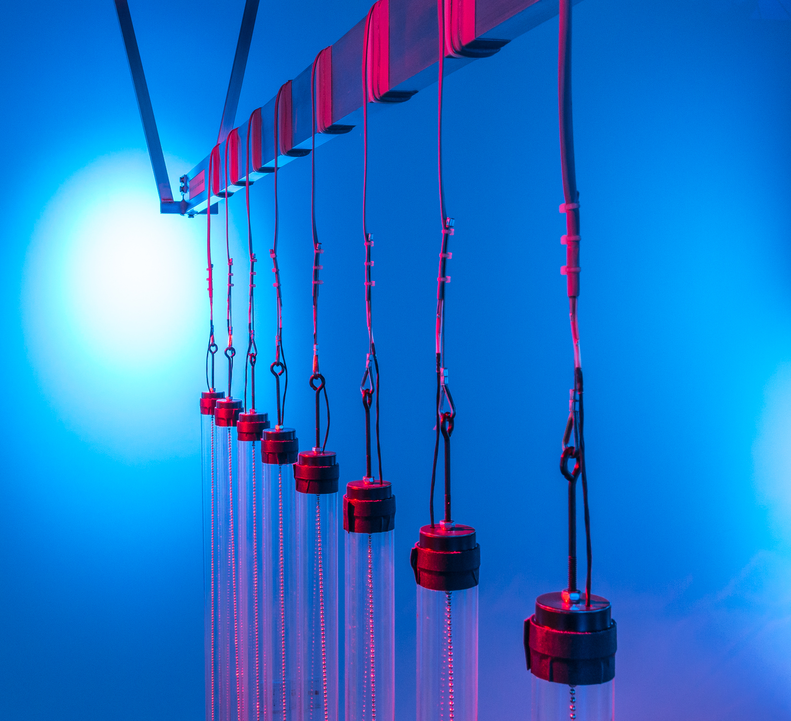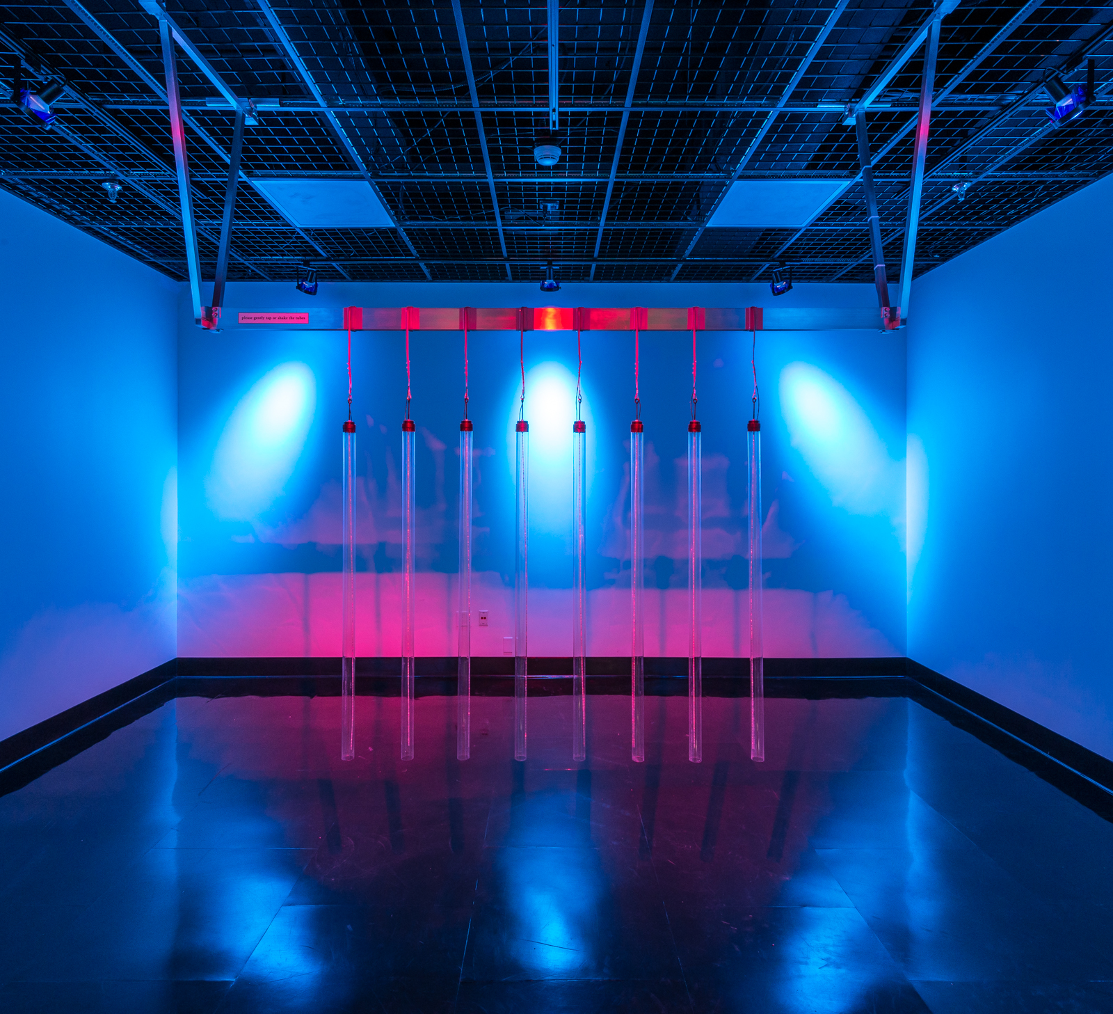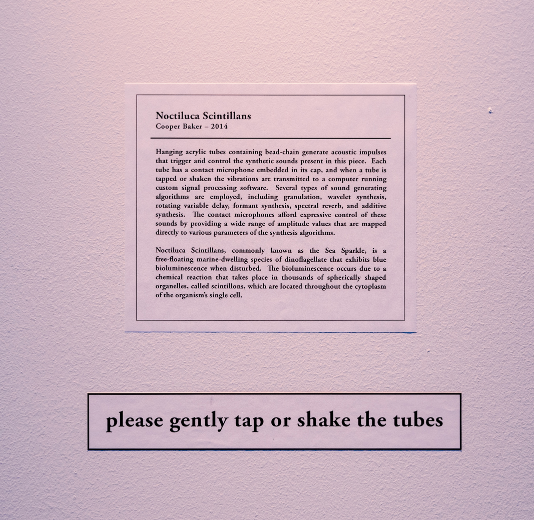Hanging acrylic tubes containing bead-chain generate acoustic impulses that trigger and control the synthetic sounds present in this piece. Each tube has a contact microphone embedded in its cap, and when a tube is tapped or shaken the vibrations are transmitted to a computer running custom signal processing software. Several types of sound generating algorithms are employed, including granulation, wavelet synthesis, rotating variable delay, formant synthesis, spectral reverb, and additive synthesis. The contact microphones afford expressive control of these sounds by providing a wide range of amplitude values that are mapped directly to various parameters of the synthesis algorithms.